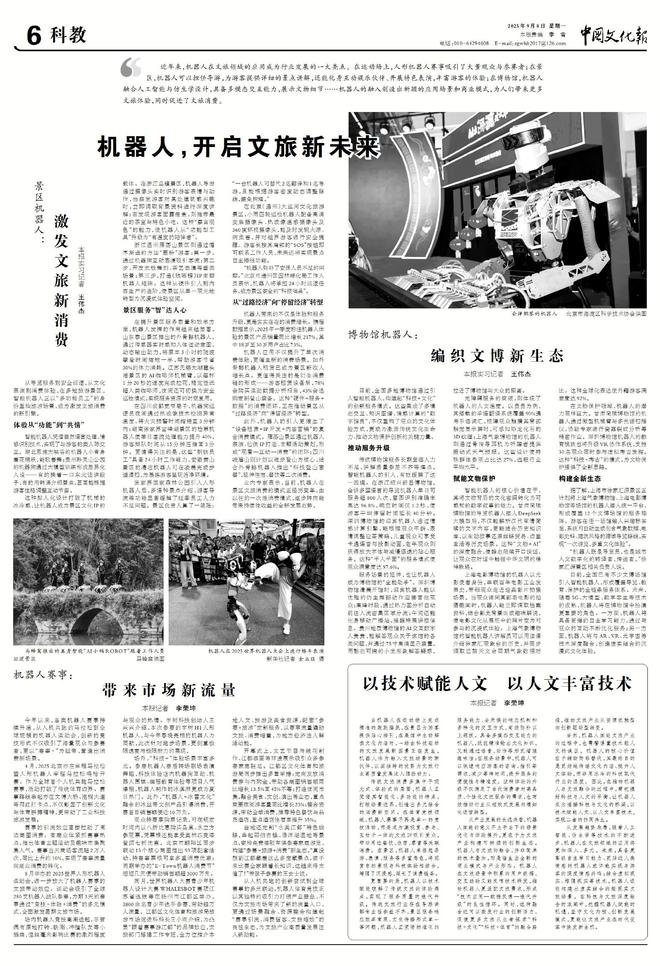 近年来,机器人在文旅领域的应用成为行业发展的一大亮点。在运动场上,人形机器人赛事吸引了大量观众与参赛者;在景区,机器人可以担任导游,为游客提供详细的景点讲解,还能化身互动娱乐伙伴、开展特色表演,丰富游客的体验;在博物馆,机器人融合人工智能与仿生学设计,具备多模态交互能力,展示文物细节……机器人的融入创造出新颖的应用场景和商业模式,为人们带来更多文旅体验,同时促进了文旅消费。