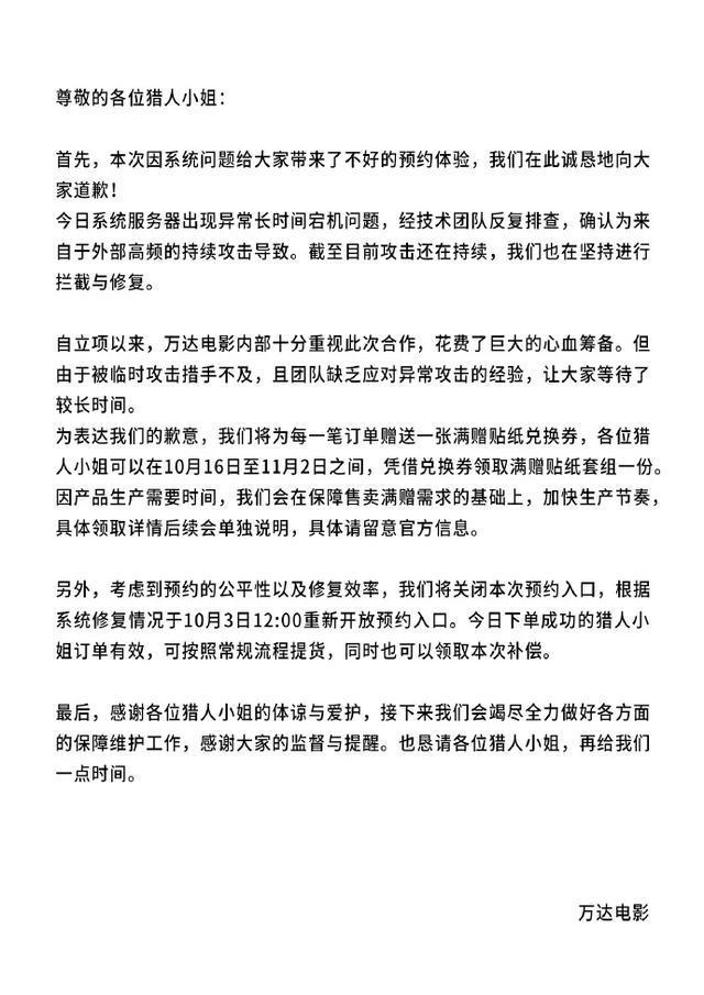 当晚,@万达电影再次发文致歉并表示10月3日12:00重新开放预约入口。