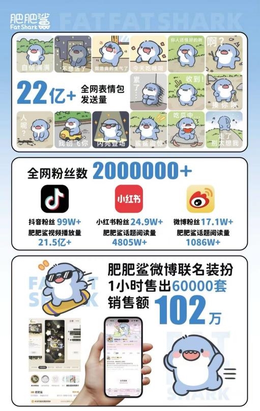 肥肥鲨全域传播势能强劲。表情包总发送量突破22亿次,成为社交沟通高频符号;抖音官方账号视频播放量超21.5亿次,获赞6284.2万,积累粉丝99.6万;小红书粉丝达24.9万,线万,线万+。
