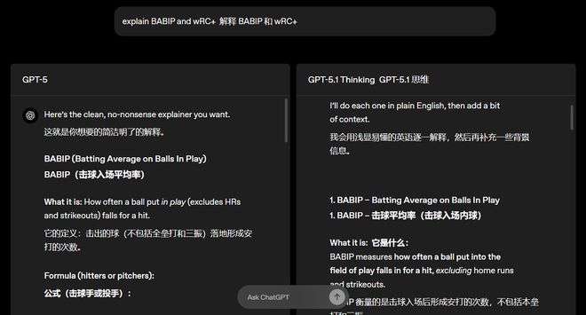 GPT-5.1 Thinking的回答还变得更加清晰了,行话更少,未定义的术语也更少。这种升级适用于工作中的复杂任务和解释技术概念。