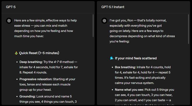 OpenAI放出了多个GPT-5和GPT-5.1系列模型在回答同一问题时的对比案例。例如,当用户向ChatGPT发送“我觉得压力很大,需要一些放松的意见”时,GPT-5.1 Instant的回答更为“高情商”:它先是表达了对用户的共情,然后再开始给出具体意见。不过,从给出的具体建议来看,两款模型的差别并不大。