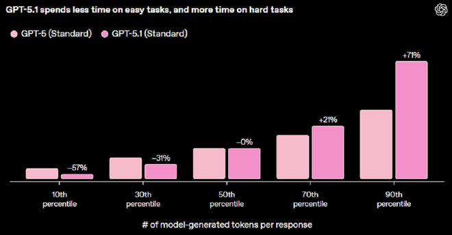 OpenAI公布的数据显示,在难度值低于50%的题目中,GPT-5.1系列模型所用的token最多减少了57%,而在难度最高的问题上,其token用量增加了71%。