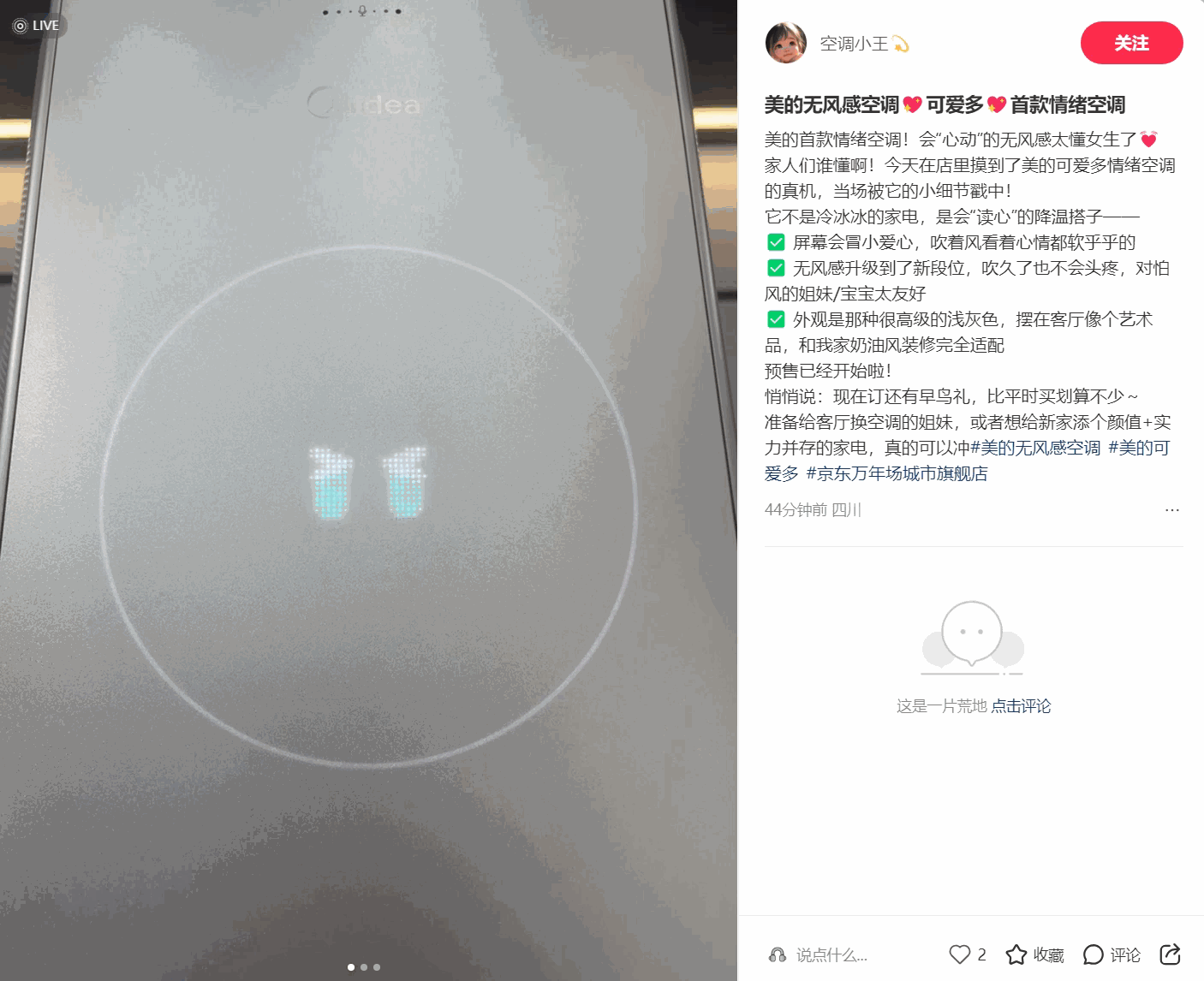 从海报可以看到,这款空调采用立式设计,空调面板上配有点阵屏幕,可以显示类似眼睛的图案。