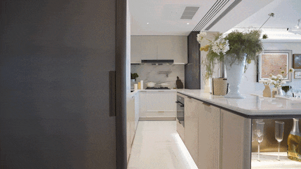 另外,因为豪宅客户对于精装美学有自己的审美,所以此次项目提供了超越行业的三大柔性定制——艺术家联名定制入户门把手、艺术家联名定制艺术门牌挂画以及墙面饰面&岛台等区域提供多款石材/岩板款式.