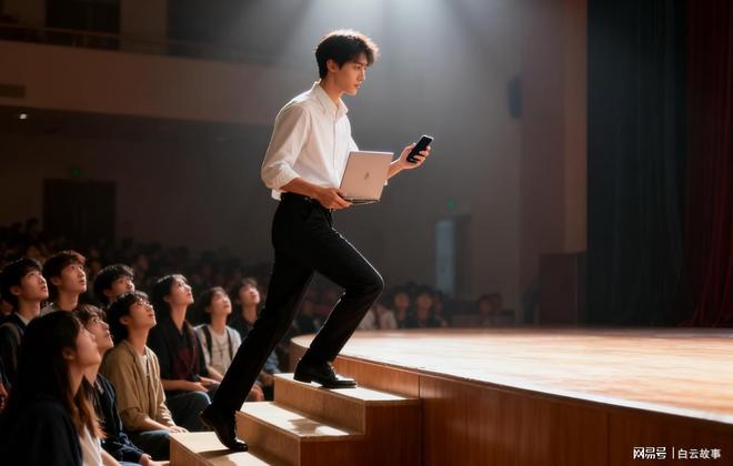他今天穿得清爽干净,站在讲台上,身姿挺拔如松。他没有多余的废话,只是简单地点头示意,然后将手机通过数据线连接到了讲台上的多媒体终端。