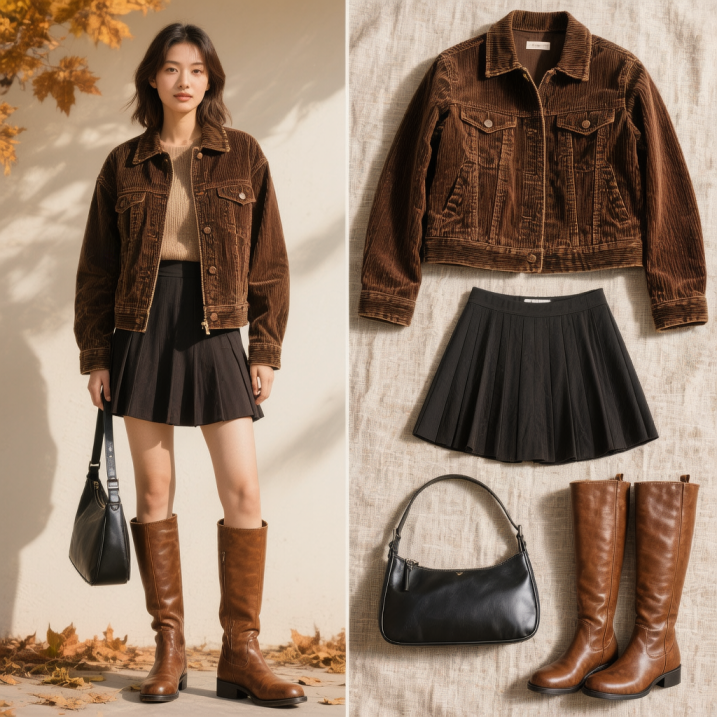 比如输入“你是一个小红书穿搭博主,请根据模特穿搭生成一张封面图片,要求: 1.画面左侧是模特的OOTD全身图;2.右侧是衣服的展示,分别是上衣深棕色夹克、下装黑色百褶短裙、棕色靴子、黑色包包 风格:实物摄影,要求真实,有氛围感,秋季美拉德色系穿搭”。在这个提示词下,混元图像3.0可以准确地把左侧博主的穿搭分解成右侧单独的衣物。