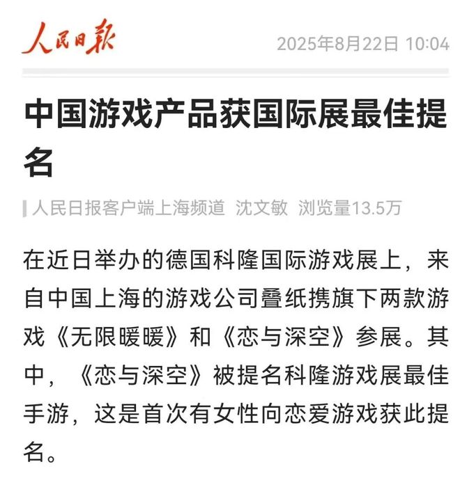 8月22日,科隆游戏展的各项大奖结果正式出炉,《恋与深空》获2025年科隆游戏展最佳移动游戏奖,成为首个获此大奖的女性向游戏作品。这不仅是对中国游戏品质的高度认可,更是中国游戏迈向国际舞台的有力证明。无论是技术的展示,还是中国文化通过数字载体向世界的传递,都预示着中国游戏产业前景一片光明。相信在不断创新与文化融合的驱动下,中国游戏将在国际市场上绽放更加耀眼的光芒,创造更多的辉煌。