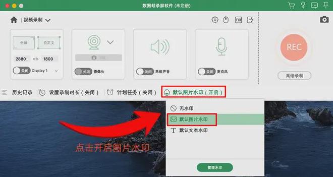 第二步,顺利进入【屏幕录制】功能界面后,用户可以根据自身需求自由选择录屏的具体区域,同时还能对音频的输入来源等进行个性化设置。还可以设置【图片水印】。等所有参数都调节至满意状态后,直接点击界面中的【开始录制】按钮,就能正式进入录制状态;