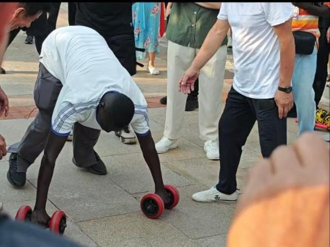 在海河畔的北安桥附近,五名跳水大爷在广场上做起腹肌轮运动。“无语哥”在现场也多次尝试,可惜均未成功。当场,“无语哥”一行还与跳水大爷们摆起在网络大热的搞怪拍照姿势合影,齐喊“我爱中国”。