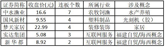 从连板情况来看,今日首板个股有53只;2连板的个股有8只;3连板及以上的个股有4只。今日连板数排名前5的个股包括中水渔业、国风新材、梦天家居、实达集团、新华都,具体如下表所示。