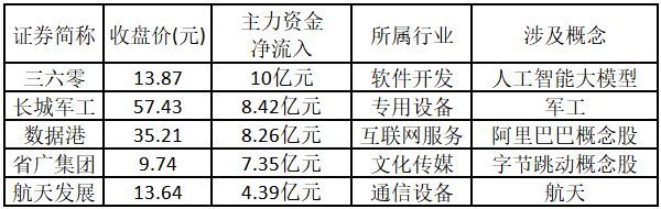 从主力资金来看,今日涨停板个股中,主力资金净流入金额排名前5的个股分别为三六零、长城军工、数据港、省广集团、航天发展。