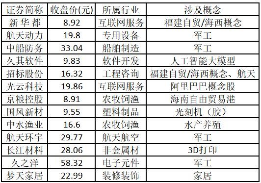 从概念特征来看,今日涨停板个股中,军工、福建自贸/海西概念、阿里巴巴概念的个股最多。