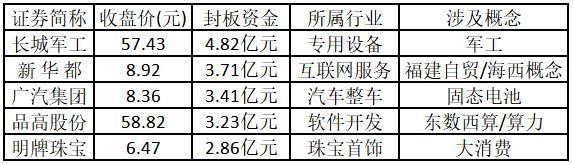 从封板资金来看,今日涨停板个股中,封板资金排名前5的个股包括长城军工、新华都、广汽集团、品高股份、明牌珠宝。欢迎大家关注微信公众号“道达号”,其“道达涨停复盘”栏目为大家解读。