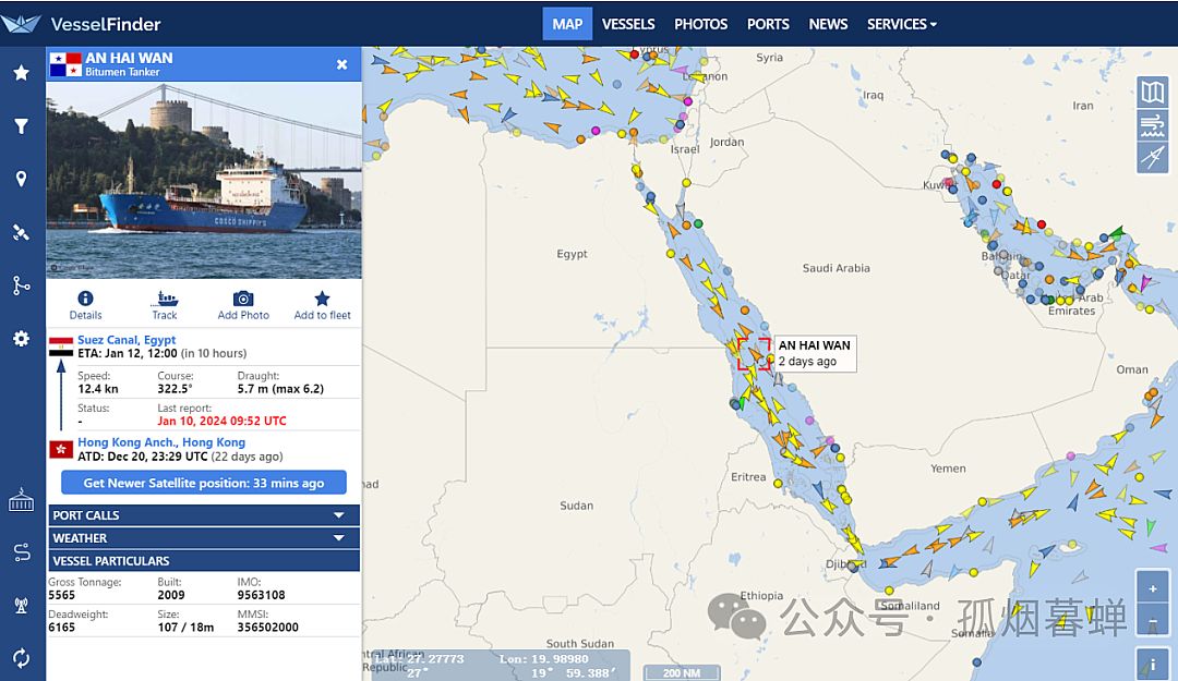 “安海湾号”(AN HAI WAN),船籍巴拿马,去年12月20日从中国香港出发,预计将于1月12日抵达埃及苏伊士。该船曾于近期停靠在中国香港桂山港,广州和东莞。当前船舶状态备注:船员来自中国(CHINESE SHIP CREW)。