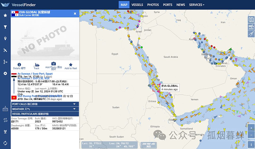 “长荣环球号”(EVA GLOBAL),船籍巴拿马,去年12月24日从越南山阳港出发,预计将于今年1月14日抵达埃及苏伊士港。该船曾于近期停靠在中国江门的新会港、中国香港和越南阳山港。当前船舶状态备注:船上载有20名中国船员(20 CHINESE CREW)。
