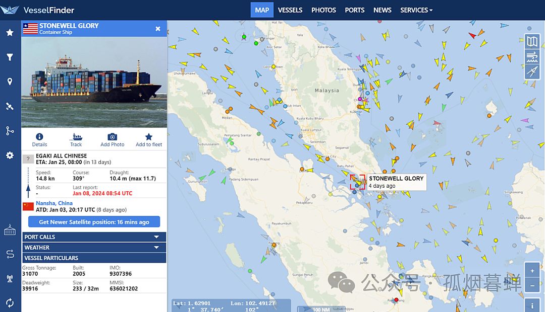 “斯通维尔·格罗利号”(STONEWELL GLORY),船籍利比里亚,今年1月3日从中国南沙港出发,预计将于1月25日抵达目的地,目的地未知。该船曾于近期停靠在马来西亚巴生港,中国青岛、上海、宁波和南沙港。当前船舶状态备注:全体船员来自中国(EGEDG ALL CHINESE)。