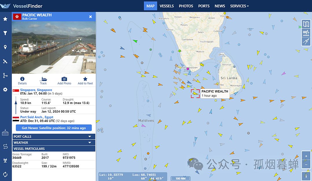“太平洋财富号”(PACIFIC WEALTH),船籍中国香港,去年12月31日从埃及塞得港出发,预计将于1月17日抵达新加坡。该船曾于近期停靠在英属直布罗陀西刚,美国新奥尔良,以及埃及塞得港。当前船舶状态备注:船员来自新加坡和中国(SGSIN_CHN VSL&CREW)。