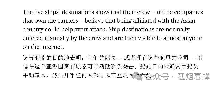 纵观彭博社这篇阴阳怪气的报道,我能从中感受出一种既羡慕、又嫉妒,同时还有一点怨恨的复杂情绪。羡慕的是那些船舶可以堂而皇之地抱中国的大腿,求中国的保佑,沾中国的红光,什么额外成本也没付出,就稍微动手改改船上的信息备注,完了就平平安安地通过红海了。