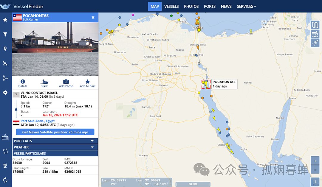 “波卡洪塔斯号”(POCAHONTAS),船籍利比里亚,今年1月10日从埃及塞得港出发,预计将于1月17日抵达终点,目的地未知。当前船舶状态备注:与以色列无关。