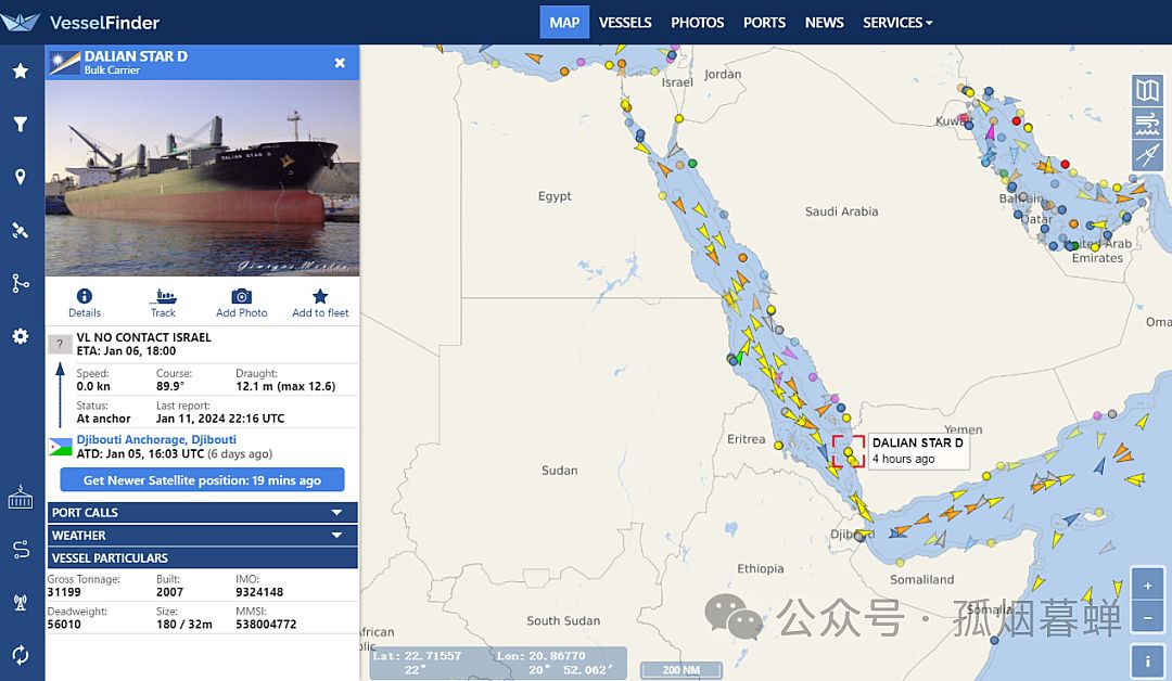 “大连之星D号”(DALIAN STAR D),船籍马绍尔群岛,今年1月5日从吉布提出发,预计将于1月6日抵达终点,目的地未知。当前船舶状态备注:与以色列无关。