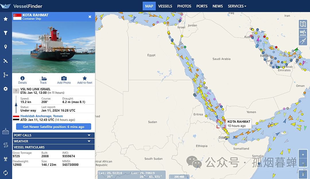 “科塔·拉马特号”(KOTA RAHMAT),船籍新加坡,今年1月11日从也门荷达台港出发,预计将于1月12日抵达终点,目的地未知。当前船舶状态备注:与以色列无关。