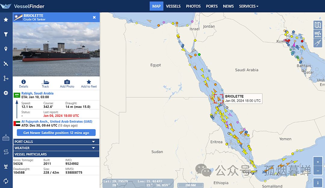 “布里奥莱特号”(BRIOLETTE),船籍马绍尔群岛,去年12月30日从阿联酋的富查伊拉港出发,预计将于今年1月10日抵达沙特的拉比格港。当前船舶状态备注:与以色列无关。