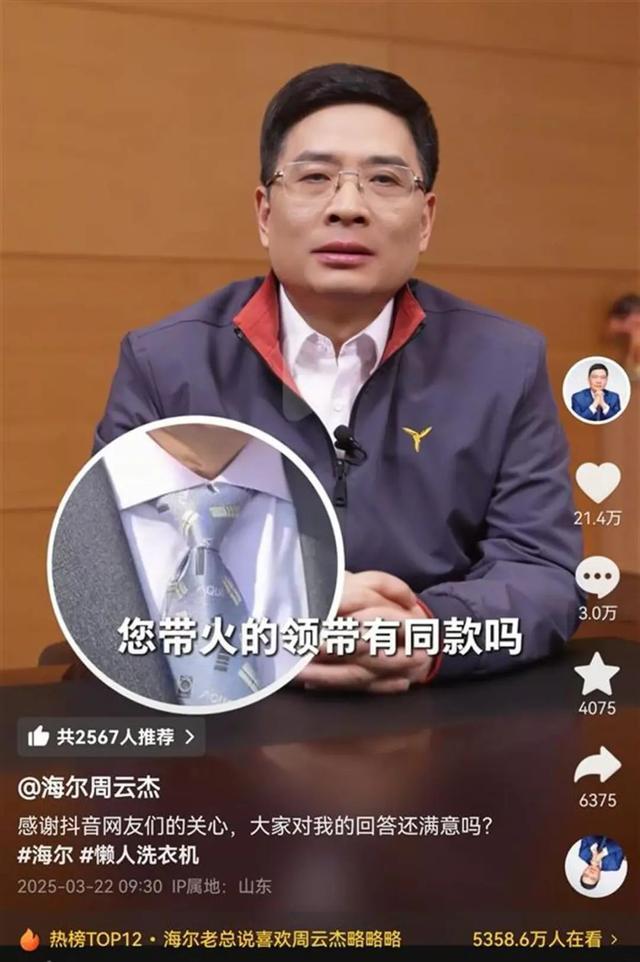 另外,还有许多网友求其出镜所穿夹克以及首条视频中西装上的海尔胸针。周云杰表示,他没想到自己的领带能火,“我们已经连夜加紧生产”,以后会围绕海尔兄弟,生产更多的周边产品。
