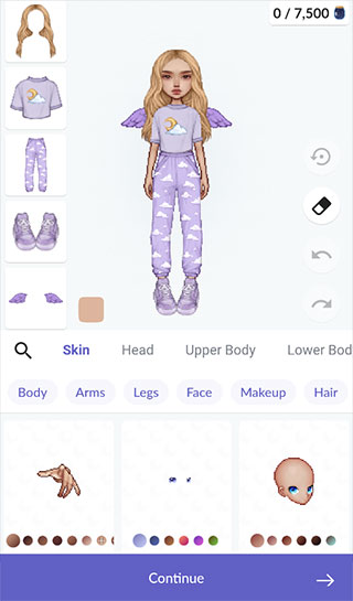 4.还可以为你的虚拟形象选择不同风格的包包,装饰完成后点击底部“continue”箭头!