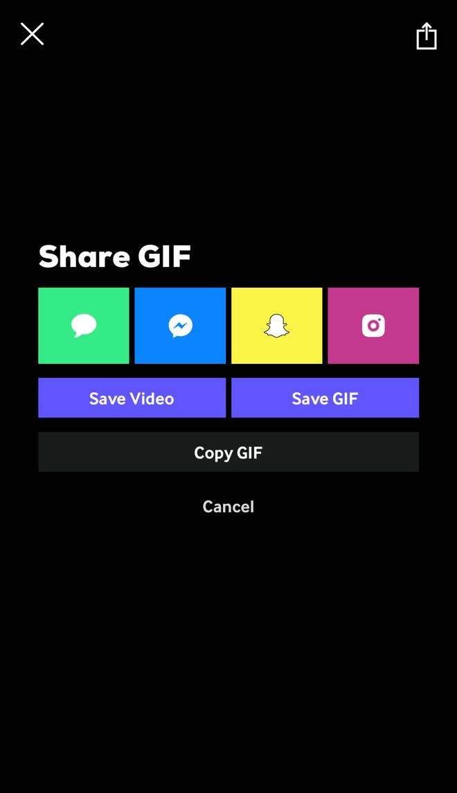 完成编辑后,点击底部的「Share GIF」按钮,在弹出的页面中,可选择保存为视频或 GIF。