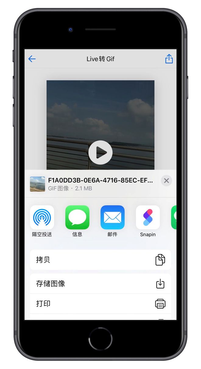 完成编辑后,点击编辑页面右上角的「分享」按钮,选择「存储图像」,就可以将转换得到的 Gif 存储到相册中。