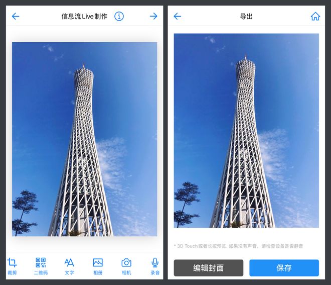 先从手机相册中选择一张静态照片,添加照片之后,你可以在照片的上方添加二维码或者图片,在「导出」页面,长按图片,可以预览得到的实况照片。