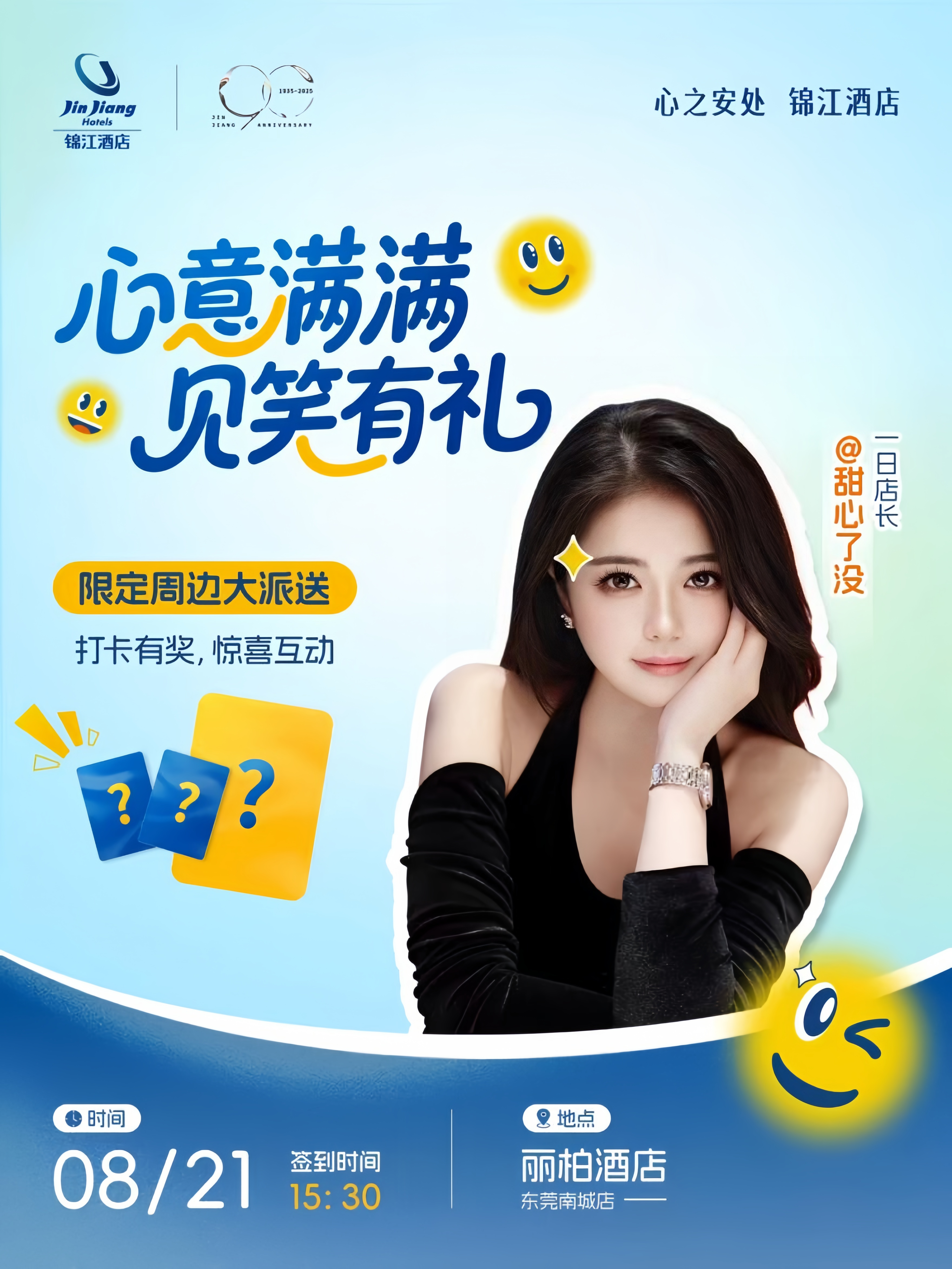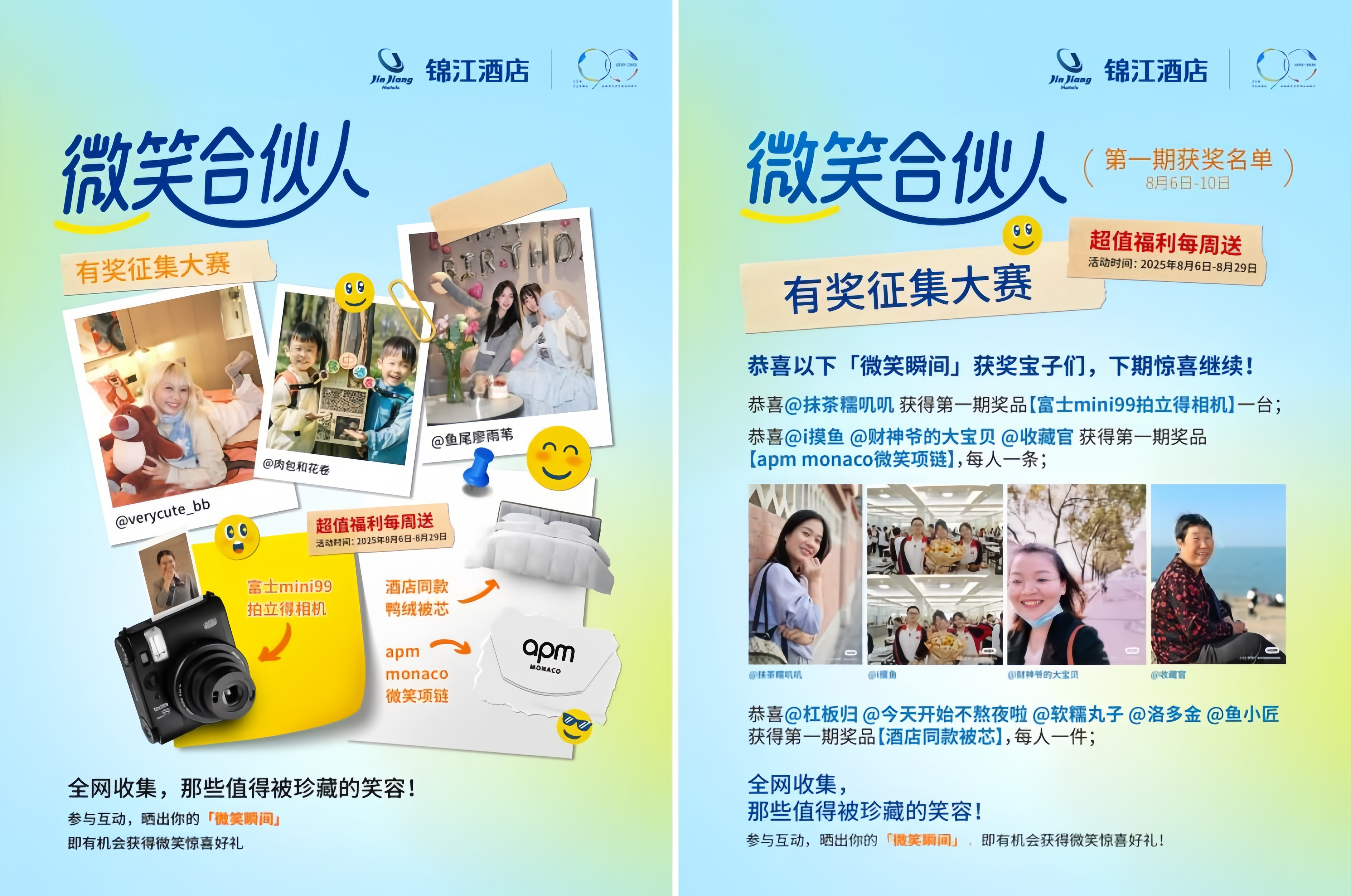 为深化品牌主张、传递服务温度,2025年8-9月,锦江酒店(中国区)推出「微笑连锁店,上心了!」主题系列活动,通过暖心视频、微笑主题店、UGC有奖征集等好玩内容,结合线上线下联合打法,在暑期出游旺季期间,持续为消费者带来别出心裁的夏日惊喜,让锦江酒店“不只是酒店,更是传播微笑的驿站”的概念深入更多人心中。