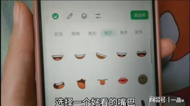 然后我们再打开下方的“嘴巴”,选择一个好看的嘴巴。在这里我需要一个红红的大嘴巴,就点这一个,立刻它的嘴巴也就选择好了,调整它的位置和大小。